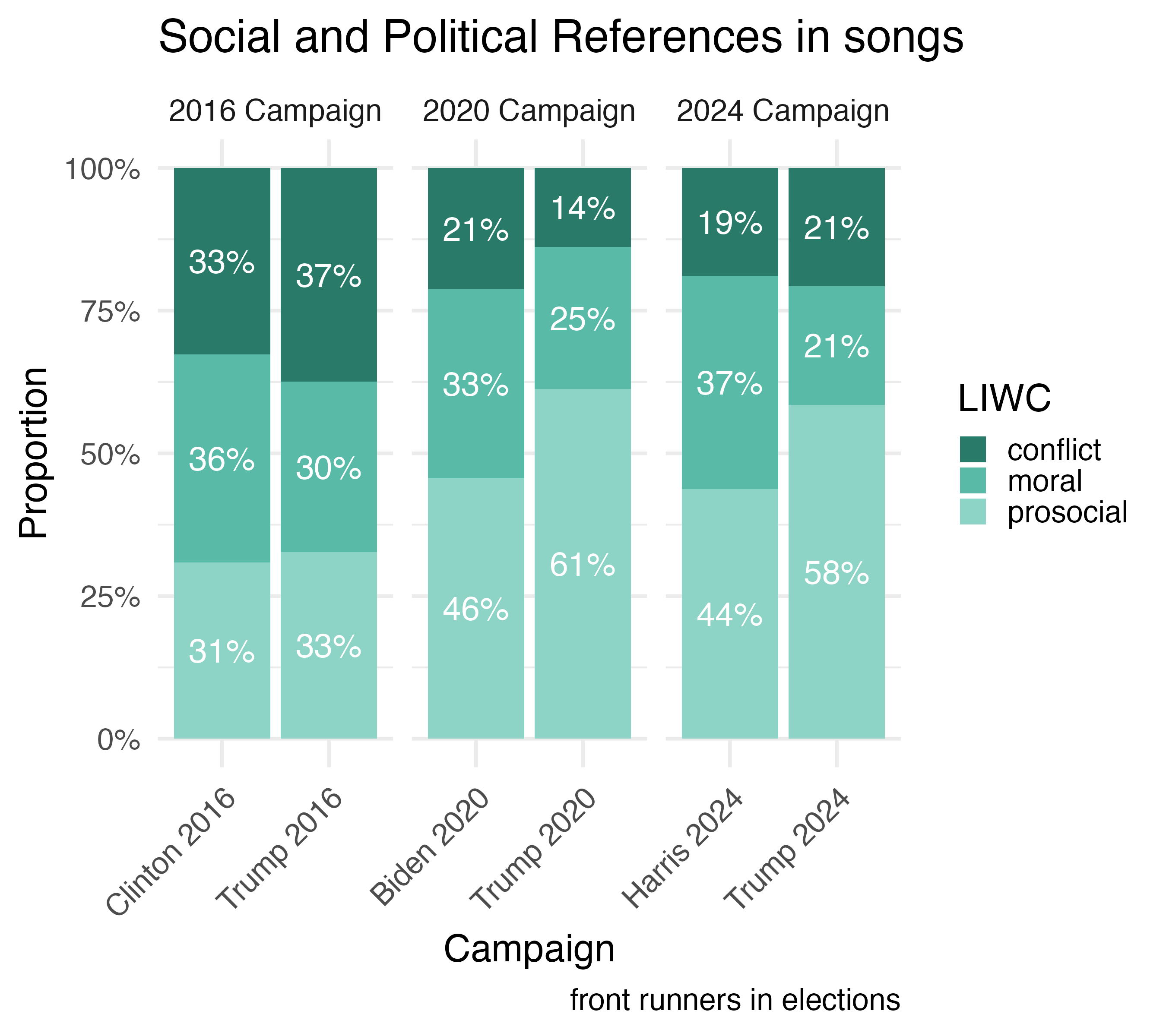 All candidates increased the use of songs with prosocial language over the elections with Democratic candidates employing more moral language in their song choices and Trump nearly doubling the ratio of prosocial language in playlists.