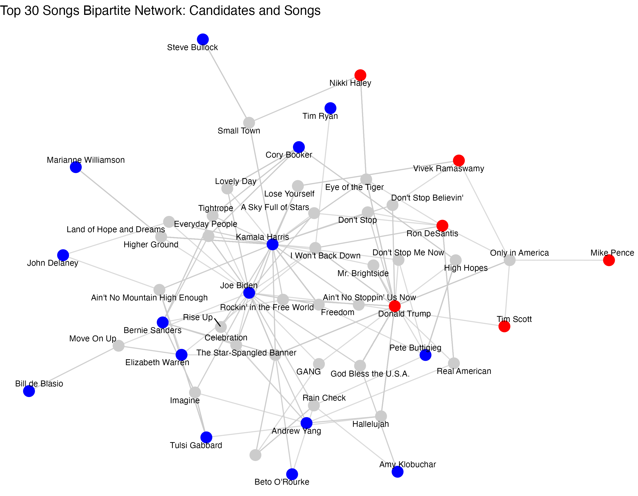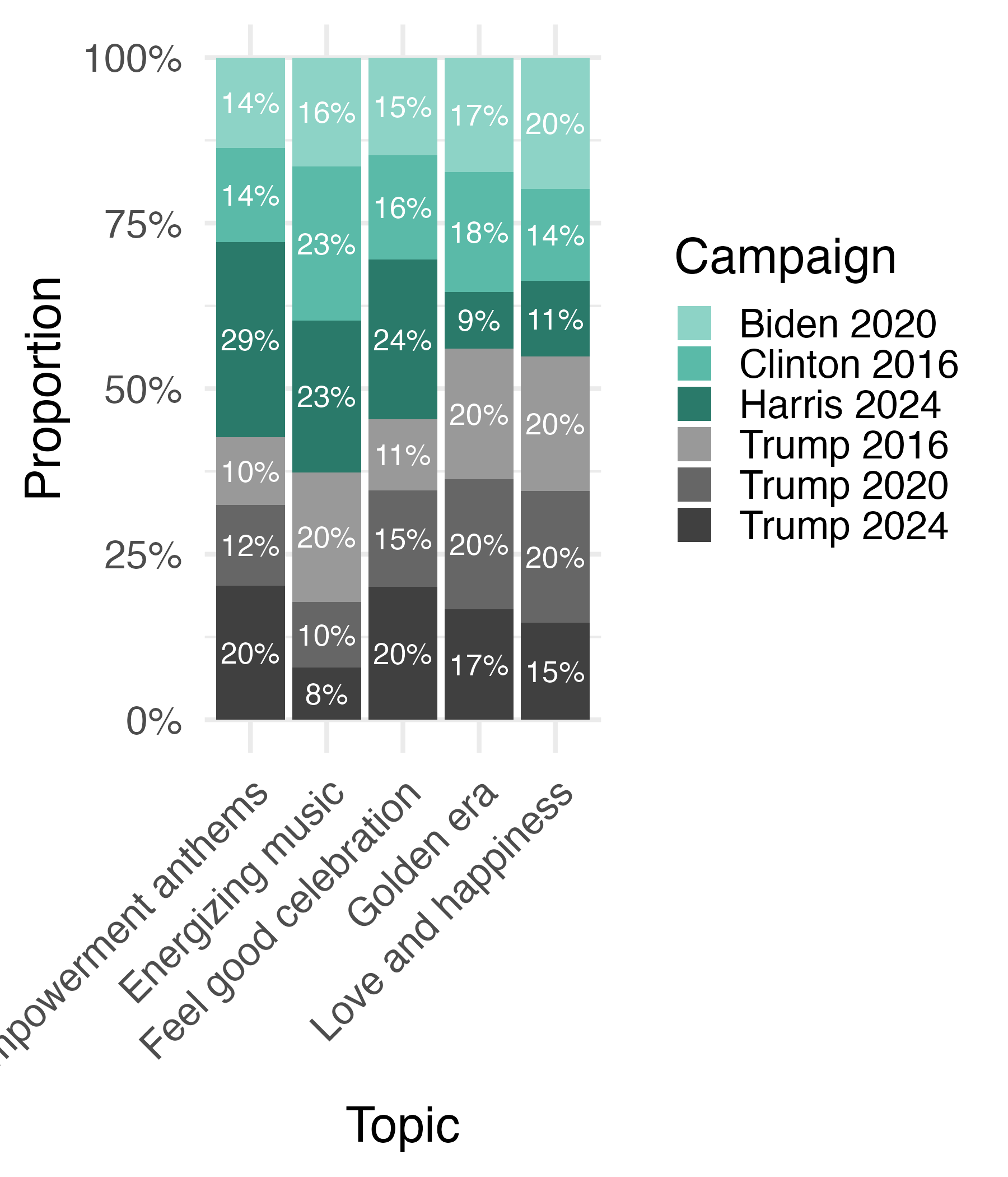 Data based on Trax on the Trail Database, focusing upon candidate-focused events (campaign launch, rally, stop, playlist, speech, town hall). Lyrics sourced from a combination of and .