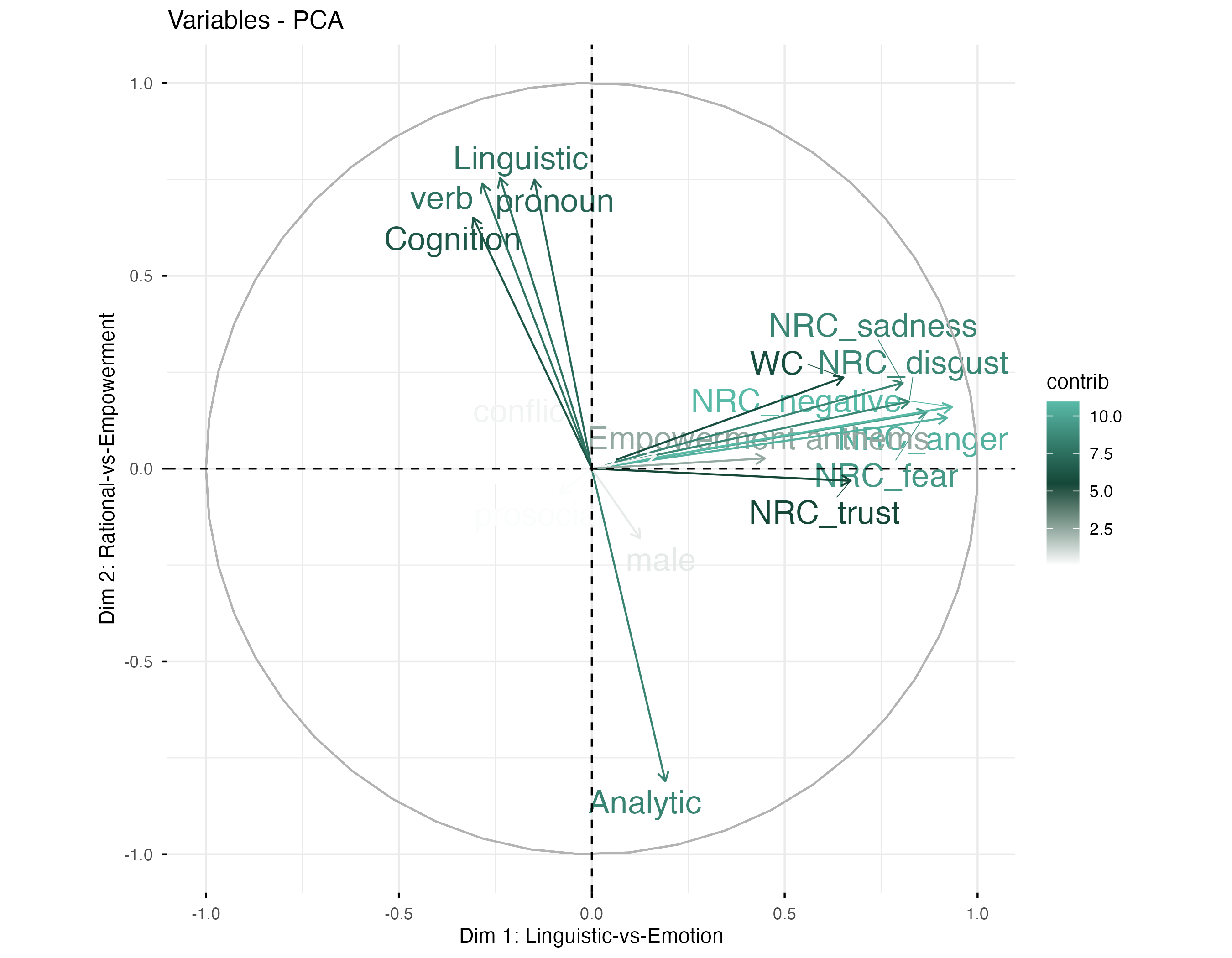 Linguistic Inquiry Word Count (LIWC) incorporates measures of linguistic use, which I use for its indicators of the following: